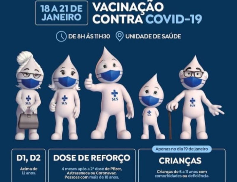 A vacinação acontece todos os dias no horário da manhã na Unidade de saúde do município. Serão aplicadas a primeira e segunda dose em adolescentes acima dos 12 anos de idade e a dose de reforço para quem tomou a segunda dose há quatro meses.