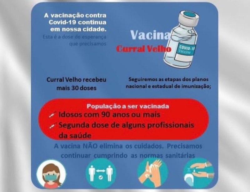 A secretaria de Saúde de Curral Velho também reforça que mesmo com a vacinação sendo realizada no município os cuidados de prevenção a proliferação do novo coronavirus devem continuar com o distanciamento social, uso de máscara e a higienização freqüente das mãos.